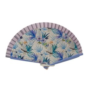• Abanico Floral con Diseño Tropical en Azul, Verde y Lila – Elegancia y Frescura Artesanal